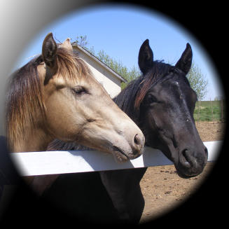 right next to the road - corrals, cedar house and blue outbuildings... horse trailer... horses :)